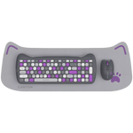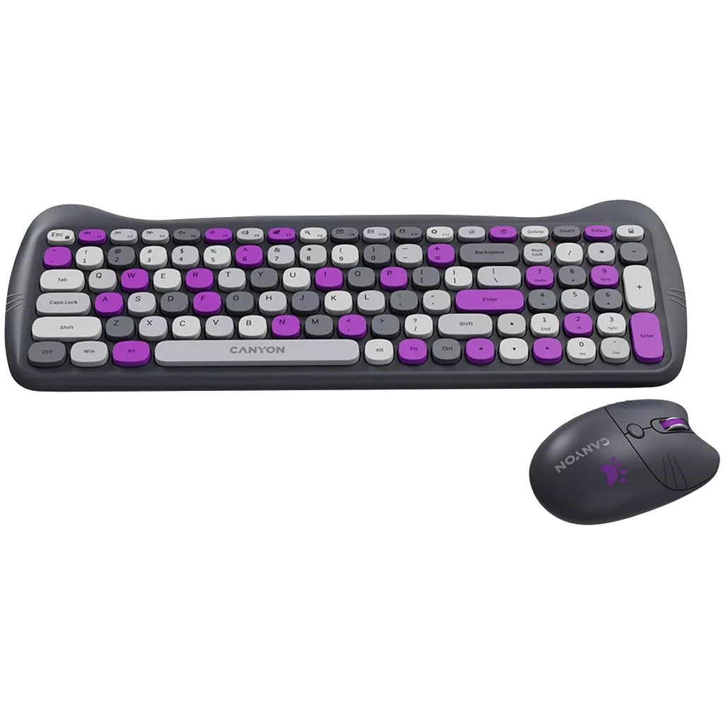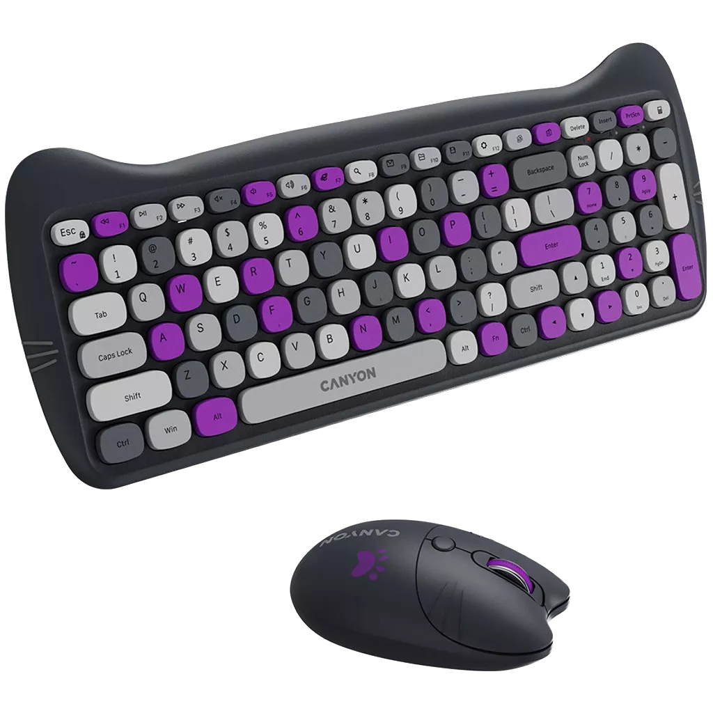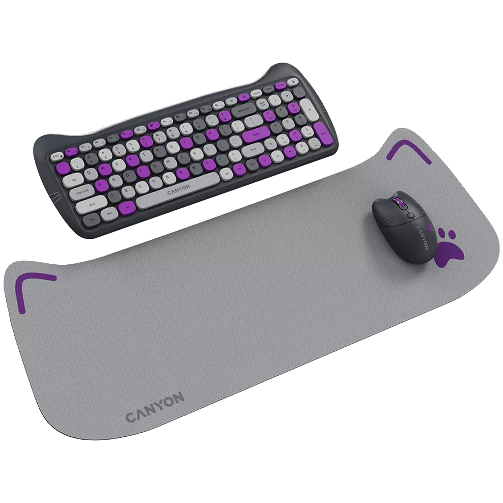 The Canyon Wireless combo HSET-W6 Kitty Edition Violete is a 2.4 GHz wireless keyboard and mouse combo designed for comfort and longevity. The keyboard features 100 keys with scissor frame switches for a responsive typing experience, as well as a slim ergonomic design and 15 multimedia keys for convenience. The mouse has 4 silent buttons and an adjustable DPI of 800/1200/1600, with a soft-touch coating for added comfort. Both devices have a long lifecycle, with the keyboard lasting 10 million keystrokes and the mouse lasting 3 million clicks. The set also includes a protective velvet sleeve for added durability.