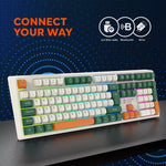 The Wireless Mechanical Keyboard Shadder GKW-11 offers 3 connection modes (2.4GHz, BT, USB) and RGB backlight with 19 modes and 8 colors. 108 buttons with a 10 million button life and whisper-quiet brown switches make for a reliable, long-lasting experience. With a splash-proof design, 8-10m operating range, and 2000mAh battery, it's both durable and convenient